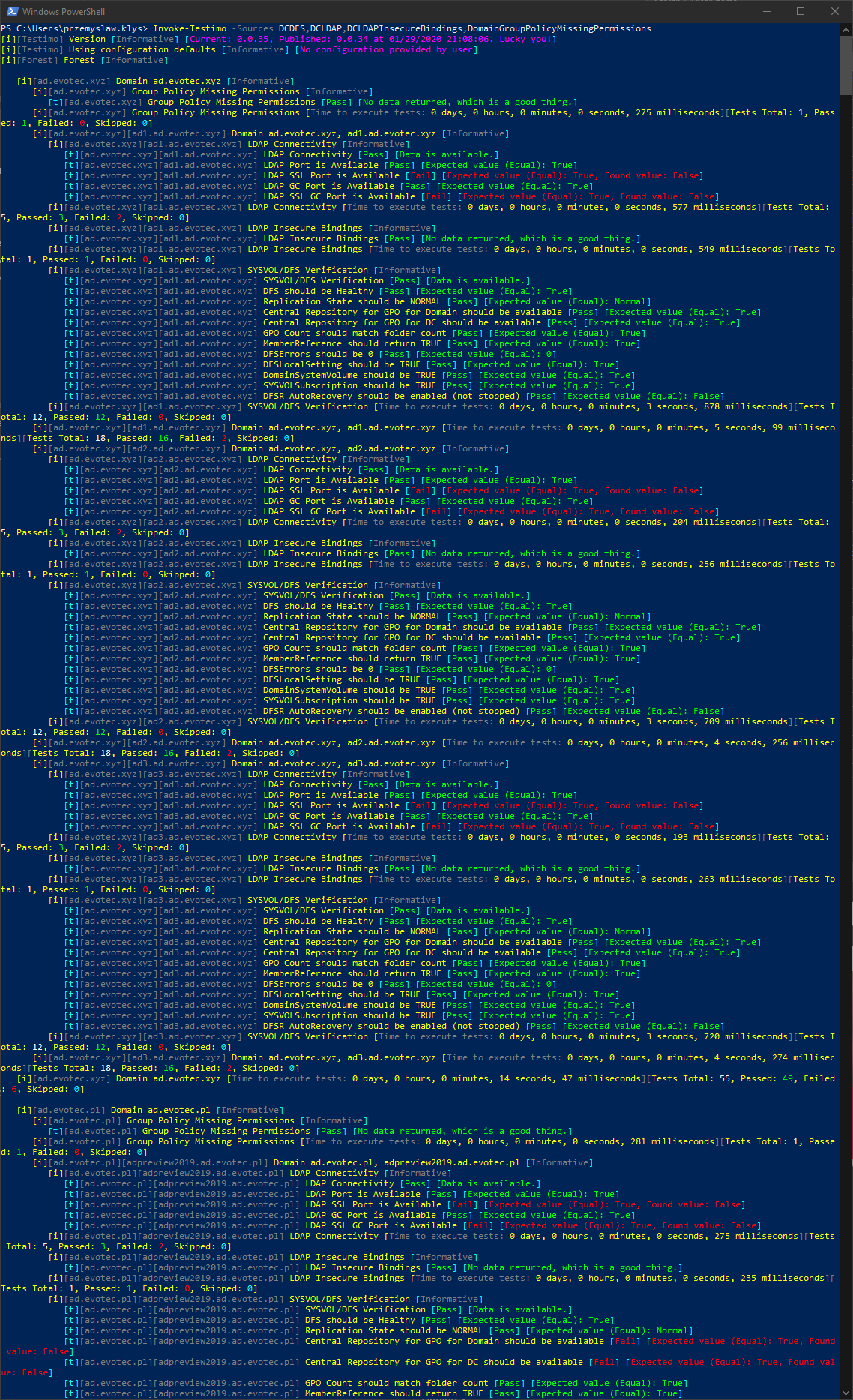 Testimo is one of my favorite **PowerShell **modules that I frequently use for quick or not so quick assessment of Active Directory. I don't have to remember all the commands for testing LDAP, finding whether **DFS **is functioning correctly or checking if Active Directory replication is working as expected.