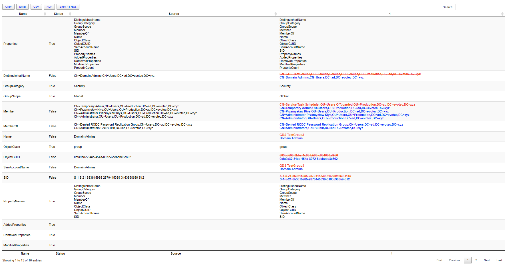 What you see above was my end goal. I wanted to easily see what the differences between one or more objects are, and what I would have to do to that object to make it the same as the source one. HighlightDifferences switch marks all data that should be deleted with red, and all data that should be added with blue. Data that is the same stays black. As you can also see on the screenshot above, there are more pages available. Out-HTMLView has a limit of 15 rows, but you can either change it in the GUI or use other parameters that are available on that command such as DisablePaging or Simplify