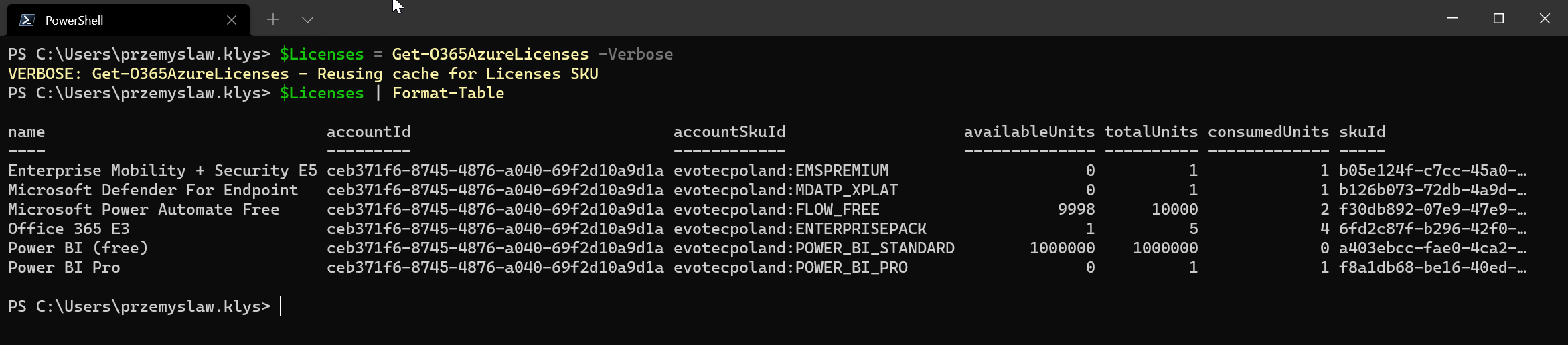 But that's not all. What I don't like about Microsoft's way of displaying data to users in their official modules or Graph API calls is that they return ID in many cases. ID for everything, and it's up to you to find out what that ID means. This is something that, for most people, in the beginning, is very hard to understand and do their own logic for that. For years, dealing with Office 365 licenses, you had to provide SKUID or ServiceName rather than what you see in the Office 365 portal. I understand there may be a reason for this, but it makes it a real pain for normal users. What does ADALLOM_S_STANDALONE mean? What is DYN365_CDS_VIRAL for? That's why if possible, for most commands that output data or even set some data, I try to allow the ability to use either ID, GroupName, Name, or DisplayName. One of those commands that may be useful for day-to-day is extracting license names and service plans for them with a full display name.