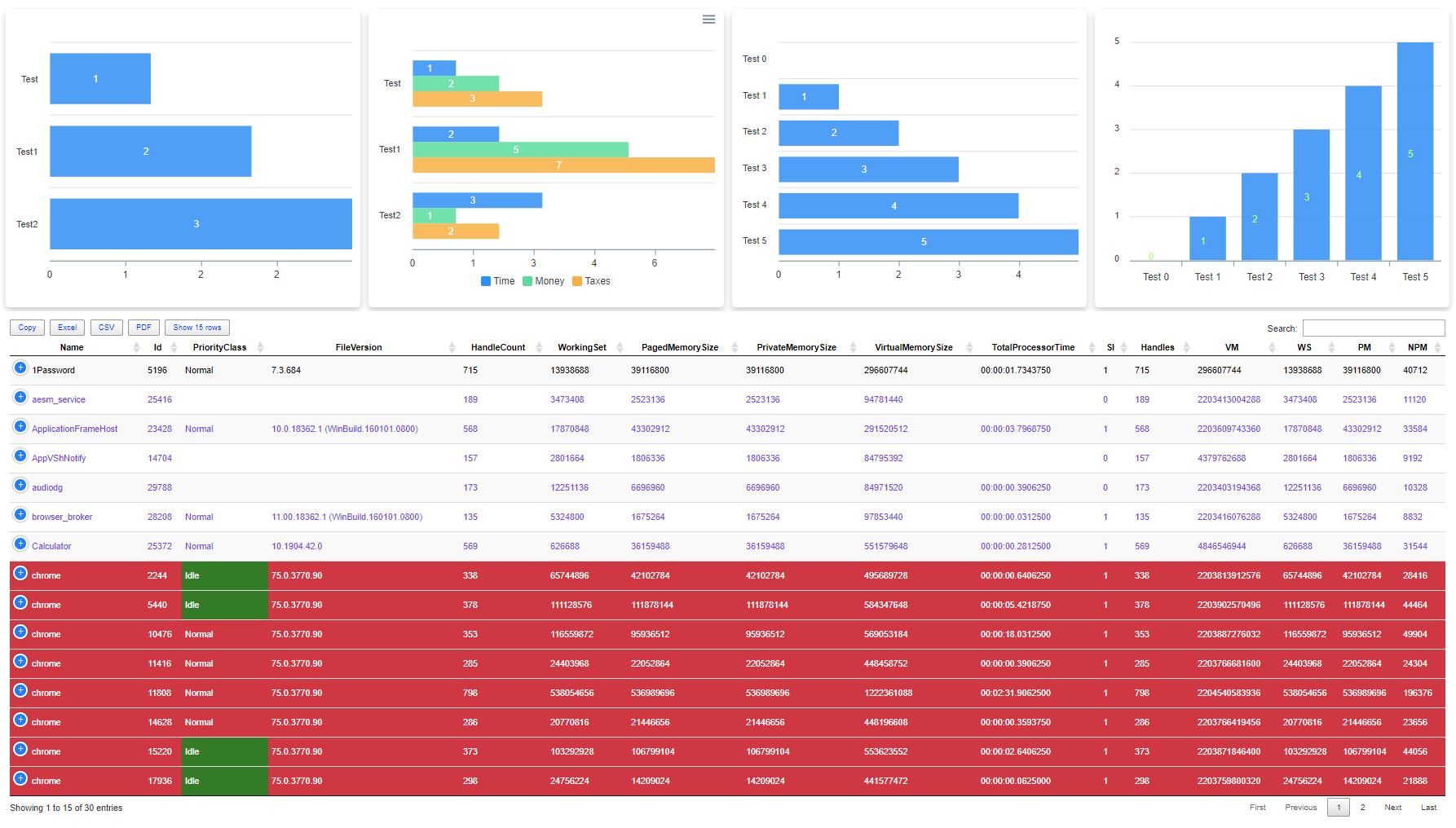 What's important here is that Conditional Table** Formatting** works on JS level. It means PowerShell doesn't take time to generate it. It happens when you open Chrome or Firefox and is processed during runtime. Of course, Panel's can also take Invisible parameter, so you don't need to see those shadows if you don't want to. So not only now you can display Table, download it to Excel, CSV, PDF, but also connect with charts. Cool right?