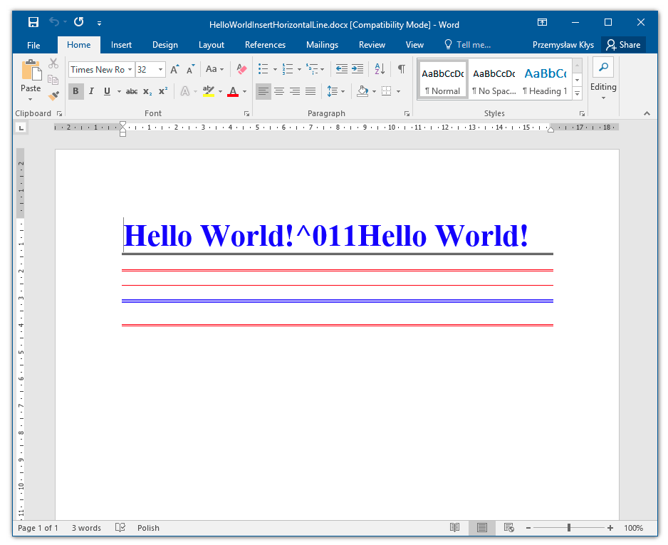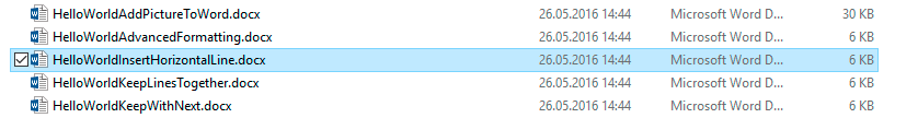 After running above code new file is created called HelloWorldInsertHorizontalLine.docx