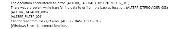 The operation encountered an error. (ALTERR_BASEBACKUPCONTROLLER_018) There was a problem while transferring data to or from the backup location. (ALTERR_DTPROVIDER_003) (ALTERR_DATAPIPE_005) (ALTERR_FILTER_001) Cannot read from file – I/O error. (ALTERR_BASE_FILEOP_039) Windows Error 1: Incorrect function.
