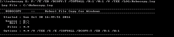 robocopy E: F: /E /ZB /DCOPY:T /COPYALL /R:1 /W:1 /V /TEE /LOG:Robocopy.log