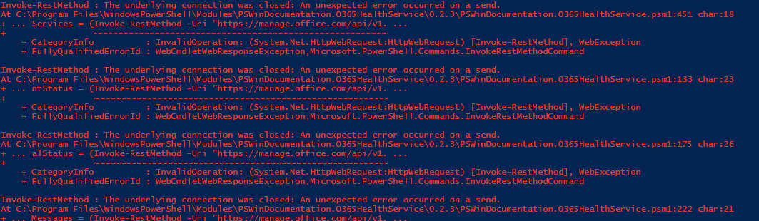 Invoke-RestMethod : The underlying connection was closed: An unexpected error occurred on a send. At C:\Program Files\WindowsPowerShell\Modules\PSWinDocumentation.O365HealthService\0.2.2\PSWinDocumentation.O365HealthService.psm1:307 char:18