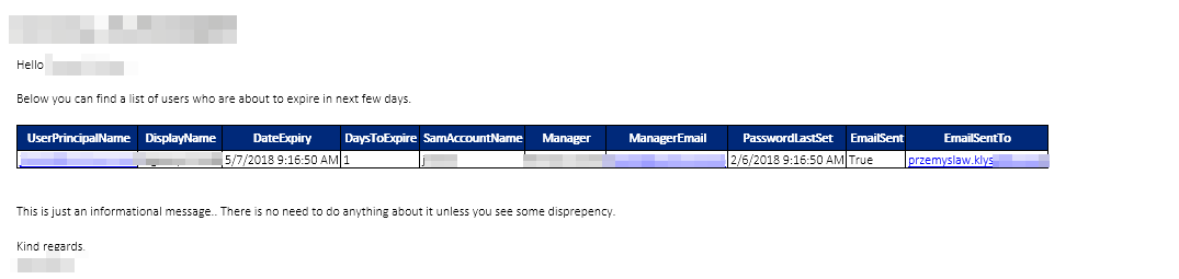A long time ago I've maintained a C# version of Password Expiry reminders. It was working based on HTML templates and was quite painful to setup and make sure it's working as expected. Problem with password notifications and setting up something that whole company will potentially get is always risky. You don't want to send 500 emails to all users just because you want to test out if your HTML template is actually looking as you want it to. So when Client asked me to enable password notifications for him I've decided that it's time to start with something new. You can of course find a lot of possible options ranging from few lines scripts, to full blow software but I had few priorities of my own. I've made sure the code is published on GitHub (so you can give feedback / report issues there) but also it's published as a module on PowerShellGallery so highly deployable.