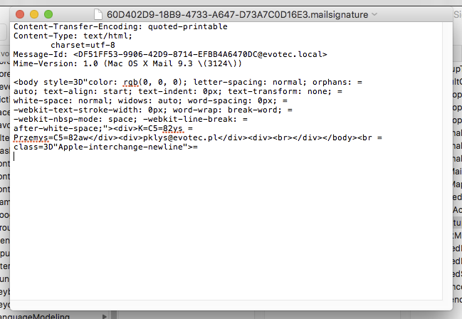 First 5 lines are meta data that needs to stay there as it is. We have to replace the code below with our HTML signature so that it becomes available inside Mail application.