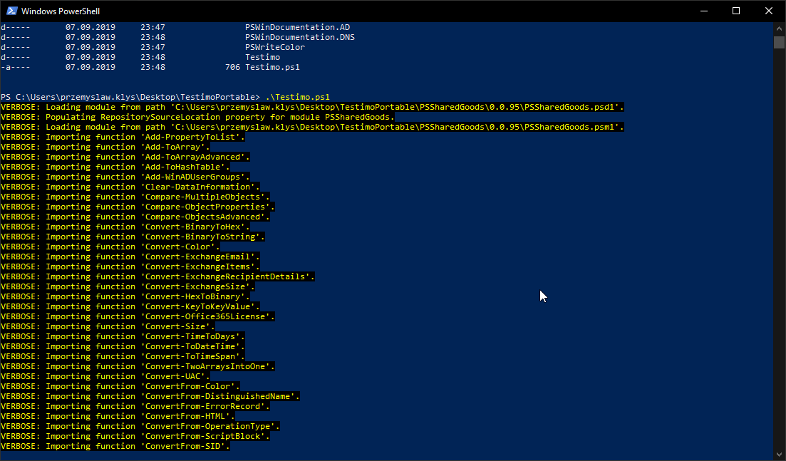 If we check directory, we can see it downloaded nine modules to that folder. You can also see the file named Testimo**.ps1** which, when executed, will Import all those modules in hopefully proper order. That means you can then copy that folder anywhere, execute with PS1 file that does all the hard work for you. After that all commands become available and you can use them as you would do after standard installation. Keep in mind that I've tested this on limited number of modules. It's possible I've skipped something when writting this. Current development version is located on GitHUB as part of PSSharedGoods module. Feel free to submit bugs if you find one.