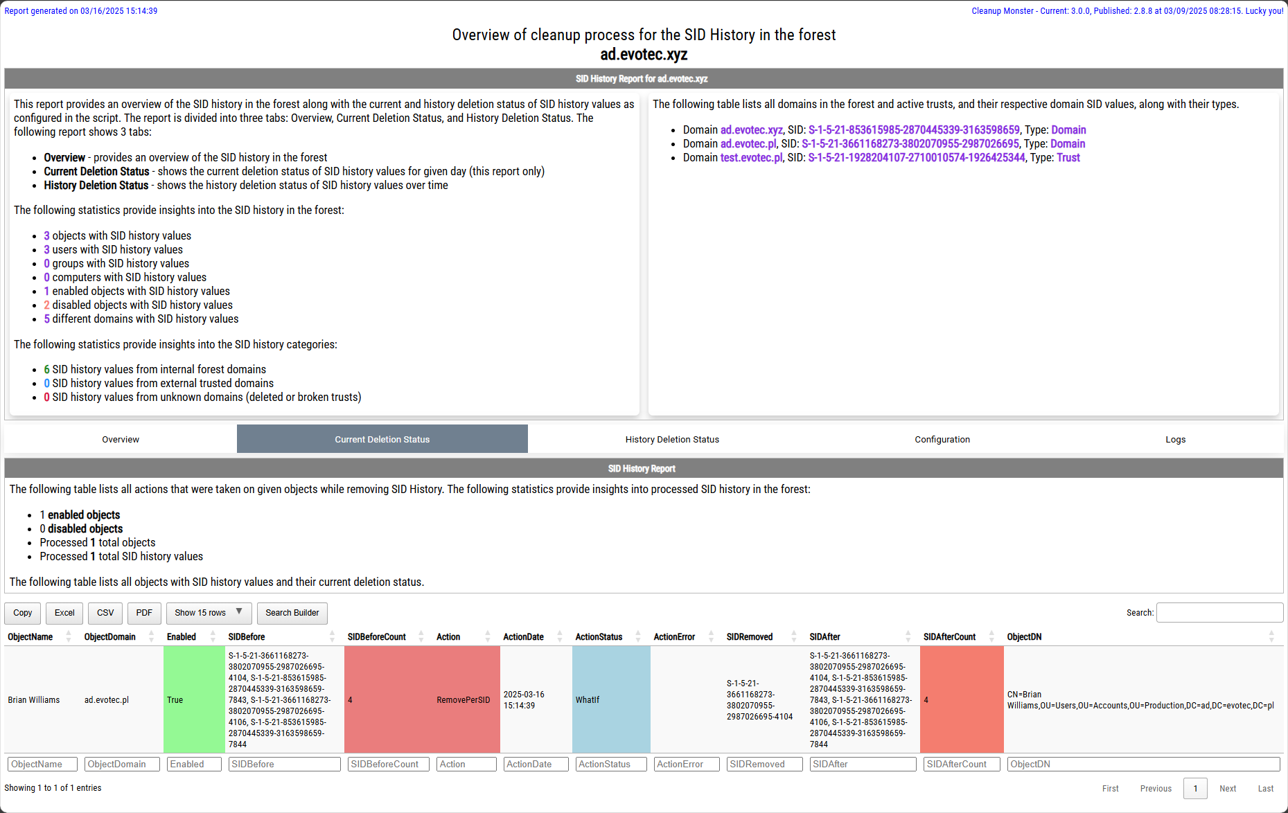- Overall report about SID History in a forest including all records, tabs with specific domain SIDs, and more