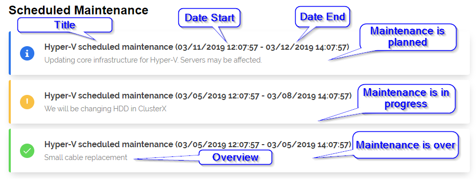 There are two ways to create maintenance. Add specially crafted JSON file (it's simple enough) generated by some of your systems, by your Service Desk agent or run this little PowerShell command. Below code adds 3 types of maintenance types. One that is planned, one that is already in progress and one that is already done. It's strictly based on DateStart and DateEnd parameters. There's no need to modify maintenance when there is time to start maintenance.