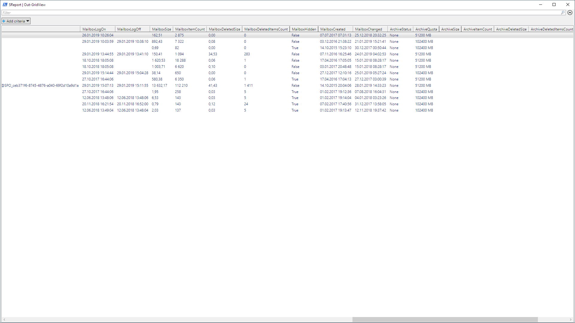 $PropertiesMailboxStats = 'DisplayName', 'LastLogonTime', 'LastLogoffTime', 'TotalItemSize', 'ItemCount', 'TotalDeletedItemSize', 'DeletedItemCount', 'OwnerADGuid', 'MailboxGuid'