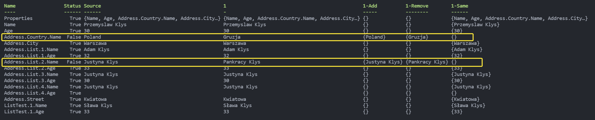 As you can see FlattenObject switch converted all nested objects into a single dimension. It converted nested hashtables arrays into properties on the top level. I've also added a new parameter called ObjectsName, which allows overriding the name of columns. It no longer needs to work with column names such as Source, 1, 2, 3, and instead, use your names. Notice I'm also using a Summary switch which allows for quick comparison where values are the same and where those are different.
