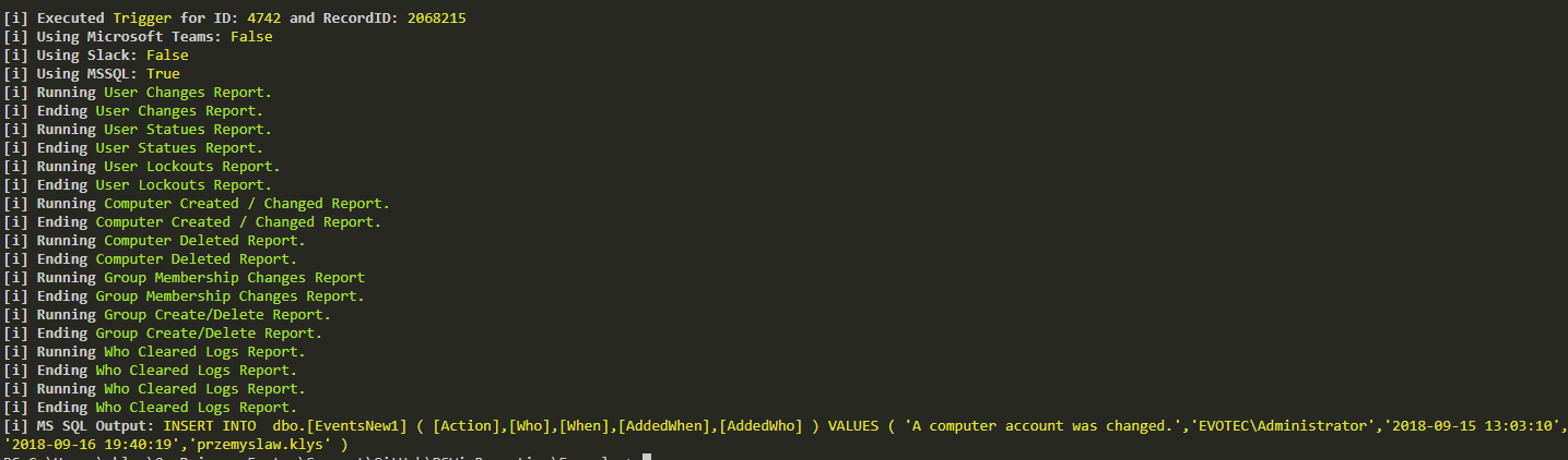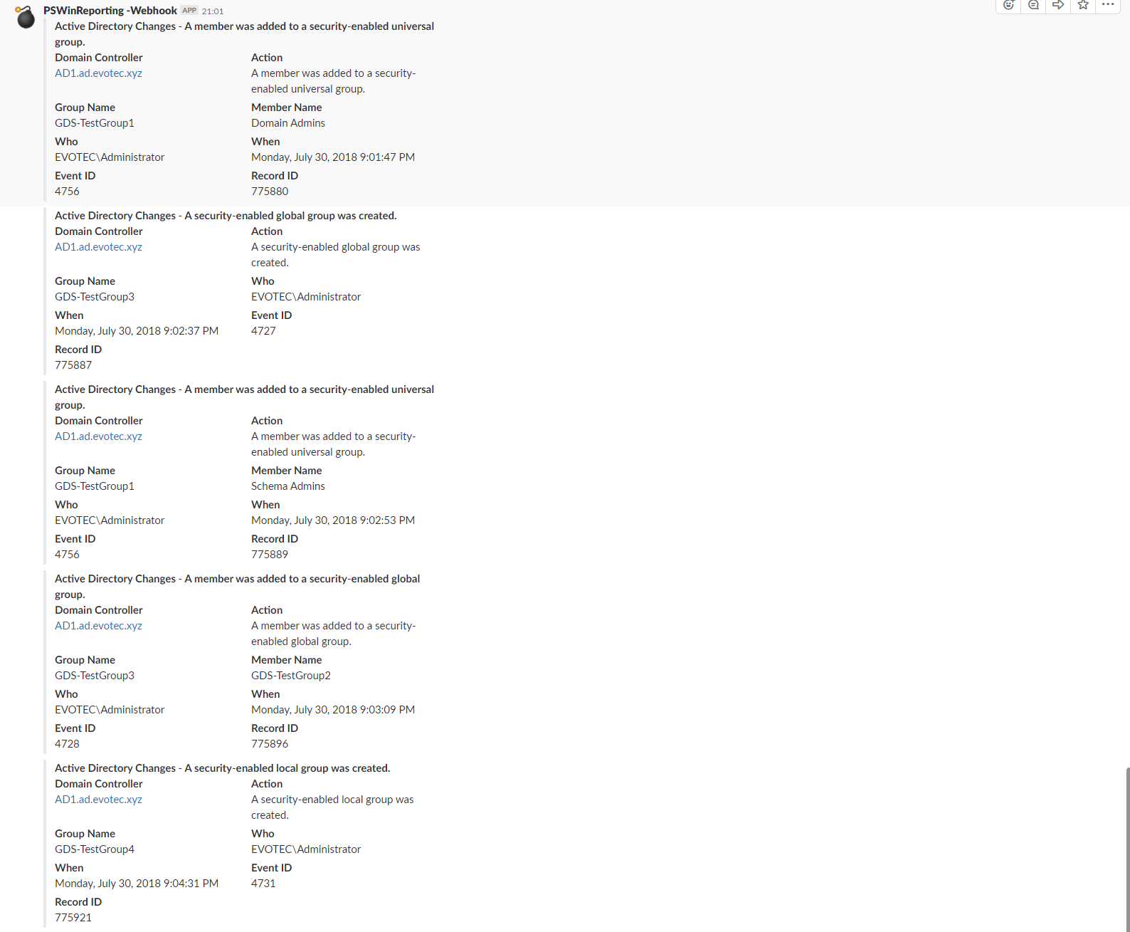 As you can see below PSWinReporting with help of **PSSlack **module from **RamblingCookieMonster ** is able to deliver almost instant notifications to your Slack channel as things happen. Of course there will be some delay due to forwarding of events but the message should show up within 1 minute since things happend.