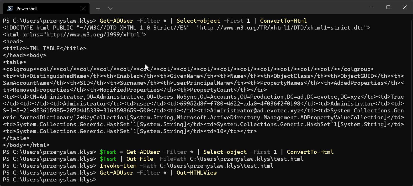 Get-ADUser -Filter * | Select-object -First 1 | ConvertTo-Html