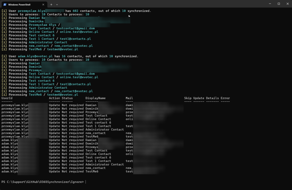 It's essential to reiterate!** Those contacts will be removed if you have contacts in the target tenant that are not on the source lists for given domains**. For the sake of exercise, if I tell it to synchronize the first 15 users but skip the first 5, the output will show that we are adding some new users, but at the same time, we try to remove those that already exist.