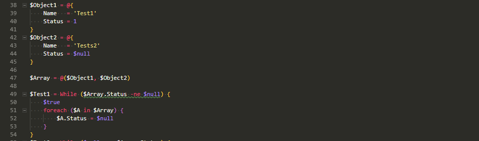 This code merely is supposed to set $null value in Status property of two objects: $Object1 and $Object2. While of course you usually wouldn't use **While **for such case, but in my code I did. When you run the code above you will get $true as an output of $Test1 variable. Everything according to plan, but with one problem – $Array.Status comparison complaining that I'm using $null on the wrong side. Let's fix it. For comparison purposes, I left both loops in the code.