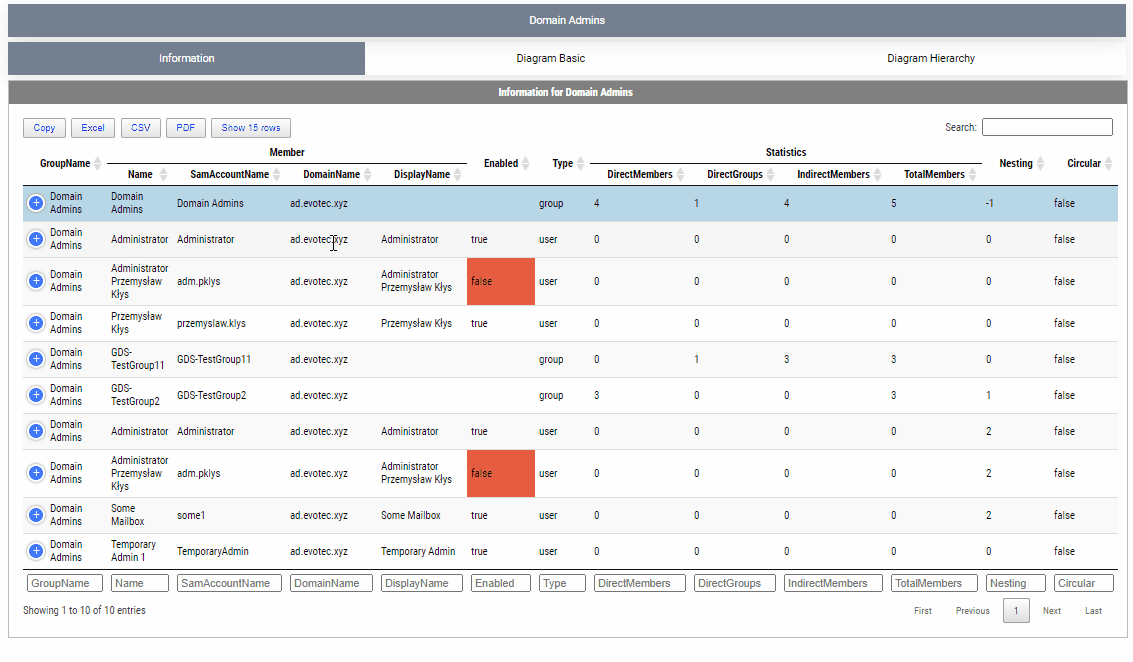 By default, when given a group name, it will show one top tab with the group name, and three-second level tabs. Table with summary (basically a copy of what you saw with Get-WinADGroupMember). A basic diagram that doesn't care for nesting where it cares for connections between members. If there are duplicates, those should be displayed only once; however, their relationships will multiply. The third diagram is a hierarchical diagram that shows nested levels and how they are connected. Each **graph **can be saved to disk with right-click as an image. You may need a **bigger **monitor to fit it all, or you can zoom-in or zoom-out as required, but more extensive diagrams will be problematic.
