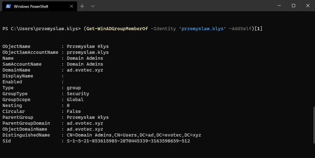 (Get-WinADGroupMemberOf -Identity 'przemyslaw.klys' -AddSelf)[1]