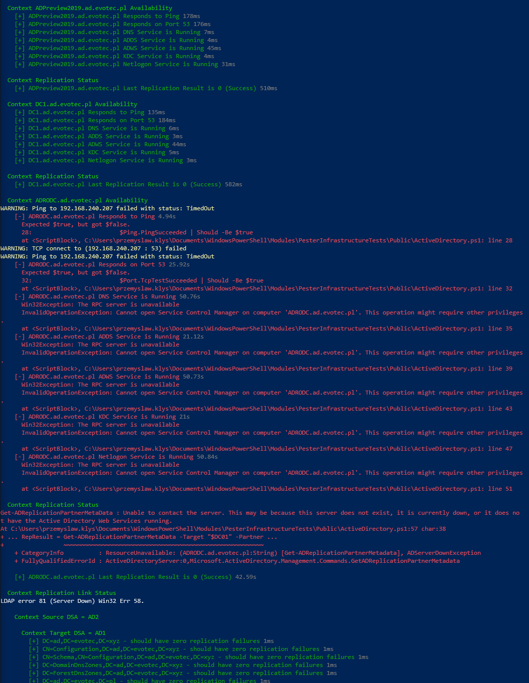 Some months ago, I saw on Twitter how Bill Kindle wrote Pester based Active Directory test. If you don't know Pester, it's a test framework for PowerShell scripts. He used it in the non-conventional way of testing infrastructure with it. It was a bit eye-opener for me even thou I know some people have done similar things before. At that time, I took his code, done some improvements, few small adjustments, and released to PowerShell Gallery under PesterInfrastructureTests name. This gave me the ability to use it freely without the need to copy/paste any code. I was using it for confirming that my or my Clients Active Directory works correctly. It covered some basic tests, but it was handy. It made me forget about the AD Replication Status Tool, and I could quickly check if everything is running correctly after Windows Updates. Let's see how PesterInfrastructureTests looks like and what it does, shall we? All we have to do is install it using Install-Module which downloads and install PesterInfrastructureTests. After that, we run a single command that targets Active Directory Forest scanning all Domains and all Domain Controllers doing some basics tests.